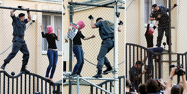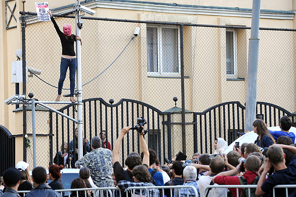 Романова, по ее словам, на заборе оказалась почти случайно: "Я сначала хотела встать просто на маленький заборчик, а потом кто-то поднял меня повыше на фонарный столб". Два полицейских, попавшие вслед за ней на территорию посольства, свинтили ее уже на земле другого государства. "Меня очень жестко стаскивали с забора за ноги, отцепляли руки от сетки, в общем-то, повалили на землю", — рассказала активистка. После этого представители посольства попросили омоновцев удалиться, а девушку напоили чаем и вывели через другой выход.