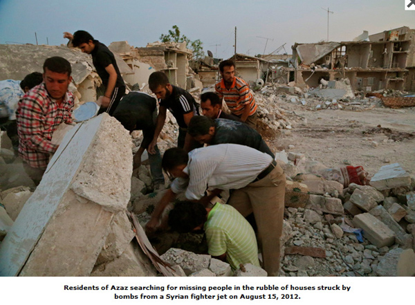 Жители Азаза ищут пропавших людей под обломками разрушенных бомбардировкой домов. 15 августа 2012 г. Фото с сайта HRW