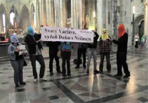 В соборе святого Вита - главном соборе Праги - группа активистов провела молебен под лозунгом "Святой Вацлав, прогони Нечаса (премьер-министр Чехии Петр Нечас. - Ред.) и Дуку (кардинал Доминик Дука. - Ред.)", протестуя таким образом против вмешательства церкви в государственную политику. Видеозапись молебна выложена на YouTube. Активисты в балаклавах развернули транспарант "Svatý Václave, vyžeň Duku s Nečasem" и несколько минут пели соответствующую молитву. После этого сотрудник полиции вывел активистов из собора, забрав у них транспарант.