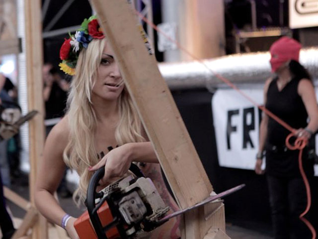 Сказано, что спиливали кресты "под овации гостей фестиваля". На сайте опубликовано 32 фотографии, на которых традиционно полуголые девушки на сцене орудуют бензопилой с надписью "pussy". У одной из активисток на теле нарисован цветной логотип движения, еще у двух на груди и животе надписи.