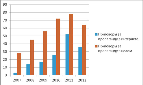 До 2008 года количество приговоров за пропаганду именно в интернете было единичным. Скажем, в 2007 году нам были известны всего три таких приговора (из 28 приговоров по ст.ст. 280 и 282 УК в целом). В 2008 году приговоров «за интернет» было вынесено уже 14 (из 45), в 2009-м – 17 (из 56), в 2010-м – 26 (из 72), а в 2011 году количество приговоров увеличилось почти в два раза: их было вынесено не менее 52 (из 78). То есть можно сказать, что «экстремистская пропаганда» преследуется теперь преимущественно в интернете. В 2012 году эта тенденция получила развитие: за первые полгода было вынесено не менее 18 приговоров (из 32).