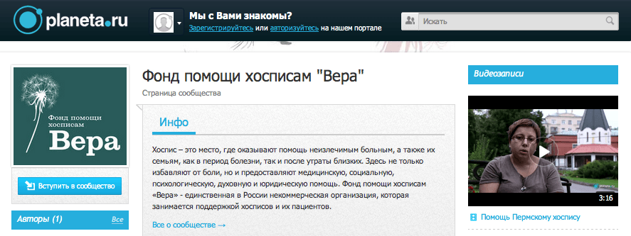 Отличный пример такого подхода – сообщество фонда помощи хосписам «Вера» на платформе Planeta.ru, где идет сбор помощи сразу для четырех проектов.