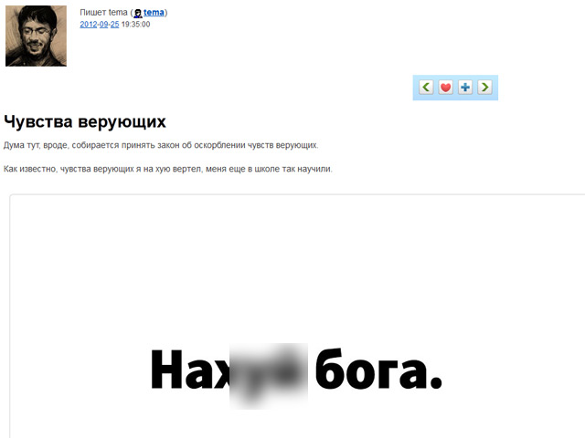 Не прошло и суток, как "православные активисты" претворили в жизнь то, чего опасался правозащитник Лев Пономарев. Они готовят иск к дизайнеру Артемию Лебедеву за то, что блоггер написал в своем "Живом Журнале" слово "бог" с маленькой буквы. Кроме этого, он еще много чего написал нецитируемого, но факт остается фактом - его намерены преследовать в том числе и за маленькую букву "б".