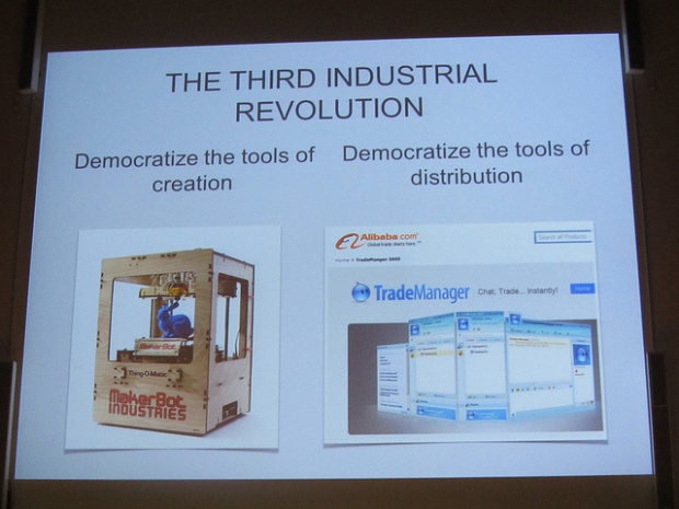 Еще один фактор — это то, что Андерсон называет демократизацией распространения. Он рассказал о сайте Alibaba.com, на котором вы можете заказать в Китае конкретную деталь по вашему собственному эскизу и описанию, и буквально через несколько дней Вы получите на дом уникальный продукт. Редактор Wired долго веселил публику рассказами, что надо было сделать, чтобы договориться о чем-то с китайскими производителями 10 лет назад: необходимость поездки в Китайв, встреча в ресторане, поедание чьих-то глазных яблок, много алкоголя, пение караоке и подобным, как назвал их Андерсон, унизительные процедуры. Однако сейчас появились три фактора, которые изменили ситуацию: