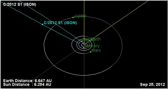 Выяснилось, что в диаметре C/2012 S1 имеет несколько километров и на момент открытия находилась в 940 млн км от Земли, между орбитами Сатурна и Юпитера. Приближаясь к Солнцу, она пройдет менее чем в 10 млн км от Марса, предоставив марсоходу отличную возможность полюбоваться ее роскошным хвостом: воздействие солнечного ветра и излучения будет сносить с поверхности кометы мельчайшие частицы льда, которые растянутся за ней.