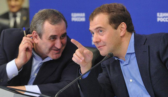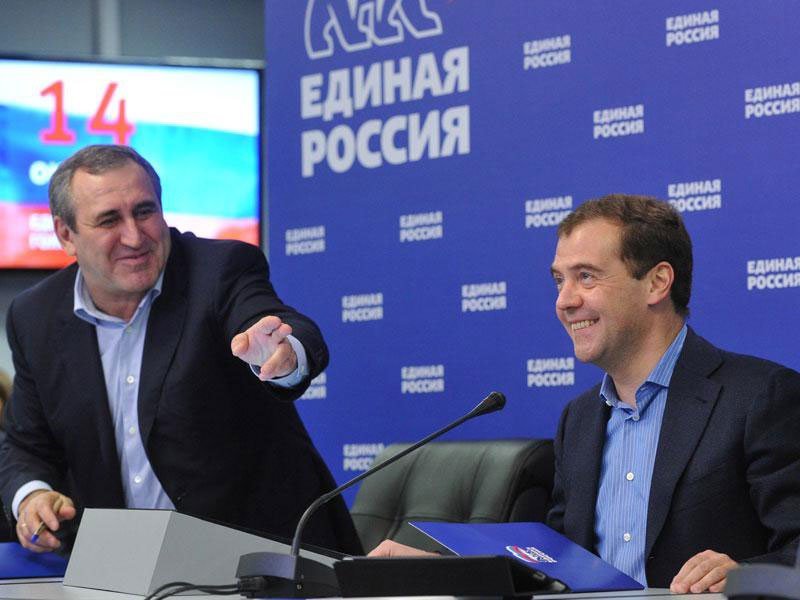Сергей Неверов и Дмитрий Медведев. Фото: er.ru Теперь и торжество Дмитрия Анатольевича становится понятным: 77 регионов, почти 5 тыс. выборов, и везде кто-то под «гнетом бэкграунда», и ведь пережили. И победили!