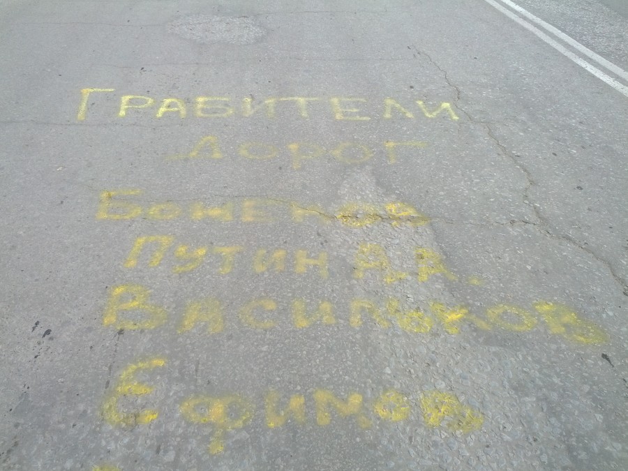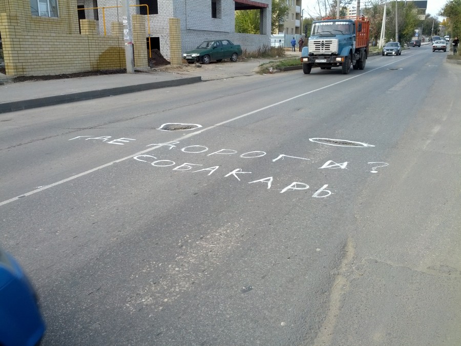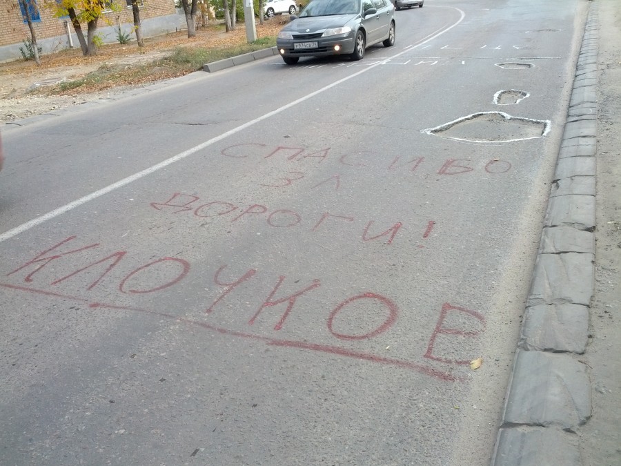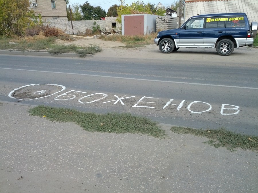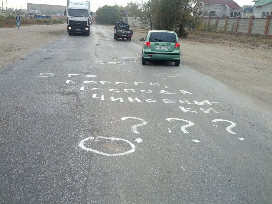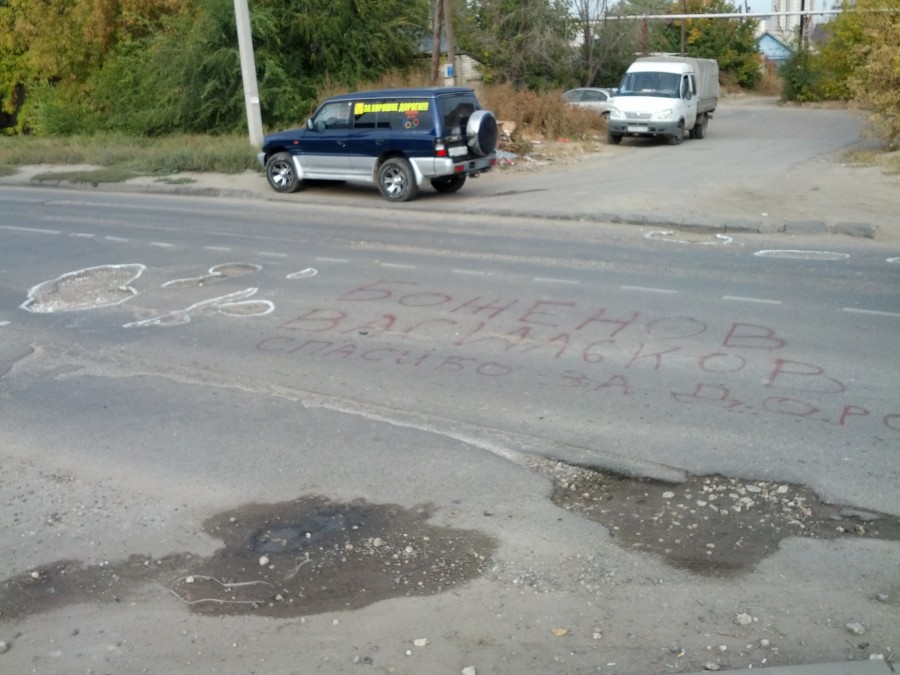 Новые "Аллеи славы чиновников", как грибы после дождя, появляются в Волгограде. Как пишет лидер движения "За хорошие дороги" Алексей Ульянов, с 16 октября в Волгограде повсеместно начали появляться надписи на центральных проезжих частях города с указаниями фамилий чиновников областной и городской власти — Боженова, Василькова, Ефимова, Собакаря, Путина, Васильева — и вопросами: "Где дороги?", "За что мы платим налоги?" и пр.