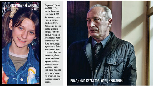«Я бы изничтожил месяц октябрь, чтобы его вообще не было в календаре. Когда наступает октябрь, начинается постоянная борьба с собой: правильно или неправильно я поступил, почему не смог ничего сделать, почему не спас дочь?» — говорит Владимир Курбатов. Ему сейчас 53 года, он работает в коммерческой организации в Москве. В Театральном центре на Дубровке у Владимира погибла дочь Кристина. Она играла в мюзикле «Норд-Ост», но в тот злополучный вечер 23 октября в спектакле не участвовала. Она репетировала с новенькими актерами. В тот вечер мать собиралась забрать Кристину пораньше, но девочка не захотела, она уговорила родителей приехать за ней после спектакля. Те поехали ужинать и снова оказались на Дубровке в полдесятого вечера, когда террористы уже захватили заложников.