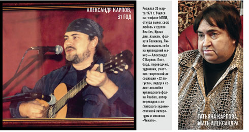 Сыну Татьяны Карповой, известному барду и музыканту, сейчас был бы 41 год, если бы он не пошел в тот вечер на мюзикл «Норд-Ост». Татьяна Карпова объясняет: «Саша просто хотел сравнить эту постановку и постановку мюзикла «Чикаго», перевод которого он тогда только что закончил. Он должен был пойти на спектакль вместе с друзьями, но им не хватило билетов, и он пошел вместе с женой. Она выжила, а Саша погиб».