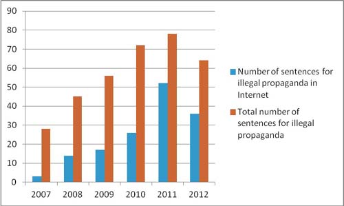 Prior to 2008, the number of convictions for propaganda specifically on the Internet was in the single digits. For example, in 2007 we only knew of three such sentences out of a total of 28 sentences, under Articles 280 and 282, for public calls to extremist activity and for incitement to racial or other similar hatred. In 2008, in just one year, the number of Internet-related convictions had already increased to 14 (out of 45). In 2009 it grew to 17 (out of 56), in 2010 there were 26 (out of 72), and in 2011 the number of such convictions increased almost twofold: there were at least 52 (out of 78 total convictions). That is to say that the majority of the "extremist propaganda" cases occur as a result of online activity. This trend continues in 2012: in the first six months there were at least 18 sentences (out of 32).