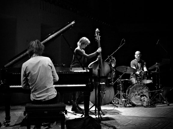 [em] Trio. Фото: Дмитрий Ермаков Посетителю фестиваля сложно отделаться от мысли: наш отечественный джаз тоже разный, но при этом какой-то одинаковый. Весьма однороден сегодня и джаз американский, и это говорит об определенном культурном застое по ту сторону Атлантики. В Штатах джаз по большей части вернулся к своей изначально развлекательной миссии, как будто не было изломанного пути 70-х с их непростым творческим поиском. Но Европа сейчас гораздо менее консервативна, чем США. И ее джаз уже давно превратился из развлекательной музыки в явление сонористическое, в совершенно отличный от негритянского блюза принцип выражения эмоций посредством музыкальных инструментов.