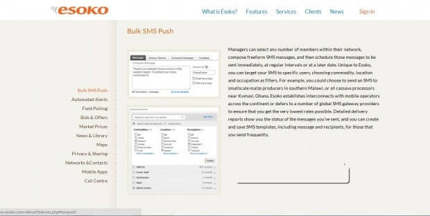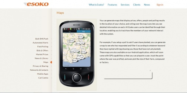 «Esoko» выполняет роль справочной службой и площадки для контакта между контрагентами с целью заключения сделок. Фермеры могут легко узнать об изменениях погоды, основных ценовых предложения и рынках сбыта, предупредить нападение насекомых-вредителей и т.д. Торговцы, в свою очередь, оставляют заявки на покупку продукции и легко контактируют с местными производителями.