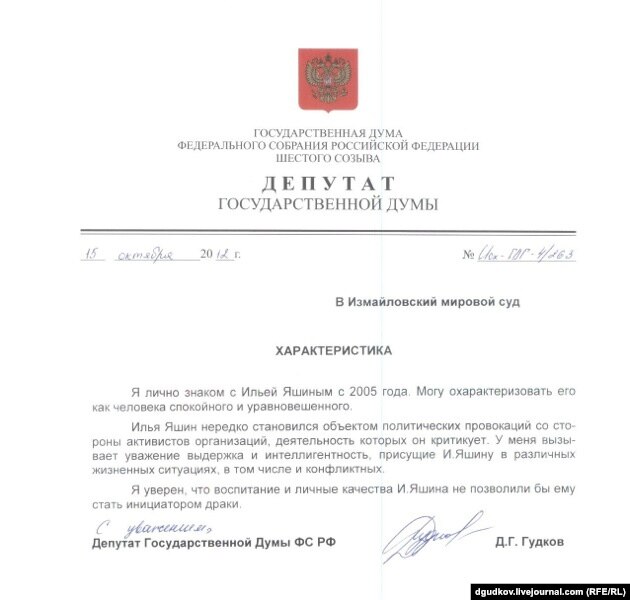 — Дмитрий Гудков (@gudkovd) ноября 19, 2012 Гудкова обвиняют в том, что он «повлиял на процесс отправления правосудия». Жалобу, используя именно такие обороты, написал бывший редактор сайта «Молодой гвардии» Владислав Калашник. Он в свое время подрался с Ильей Яшиным, на которого после потасовки было заведено уголовное дело. Гудков за Яшина заступился, отправив в суд такую характеристику.