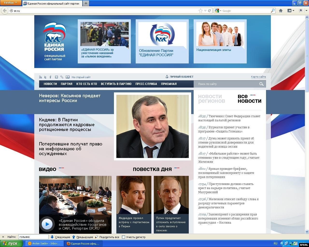 — МАРК ФЕЙГИН (@mark_feygin) ноября 19, 2012 18:50 19.11.2012 "У нас же не 37-й год", - сказал как-то на днях президент России. Действительно, не 37-й, на дворе - 2012, а риторика... Вот сегодняшняя главная страница правящей российской партии. Обратите внимание на Касьянова, который "предает интересы":