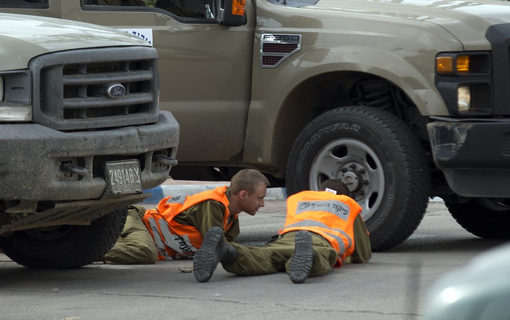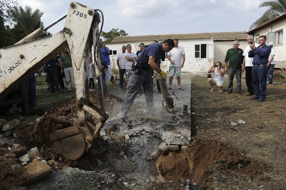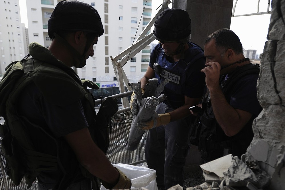 Сапер полиции Израиля осматривает ракету взорвавшуюся во дворе жилого дома одного из южных городов страны.(Фото DAVID BUIMOVITCH/AFP/Getty Images)