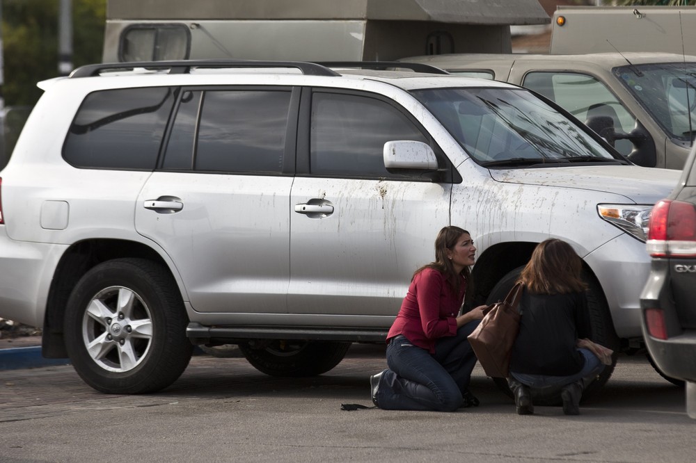 Женщины прячутся возле машины во время очередного обстрела (Фото JACK GUEZ/AFP/Getty Images)