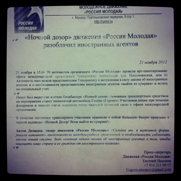 Пока готовился материал, стало известно, что прокремлевские "молодежки" провели акцию у российского офиса Transparency International. Об этом в Facebook написала глава отделения Елена Панфилова. Около двадцати молодых людей встали напротив офиса с плакатом "Ночной дозор. Всем выйти из сумрака". Как выяснилось позже, к акции причастны активисты движения "Россия молодая".