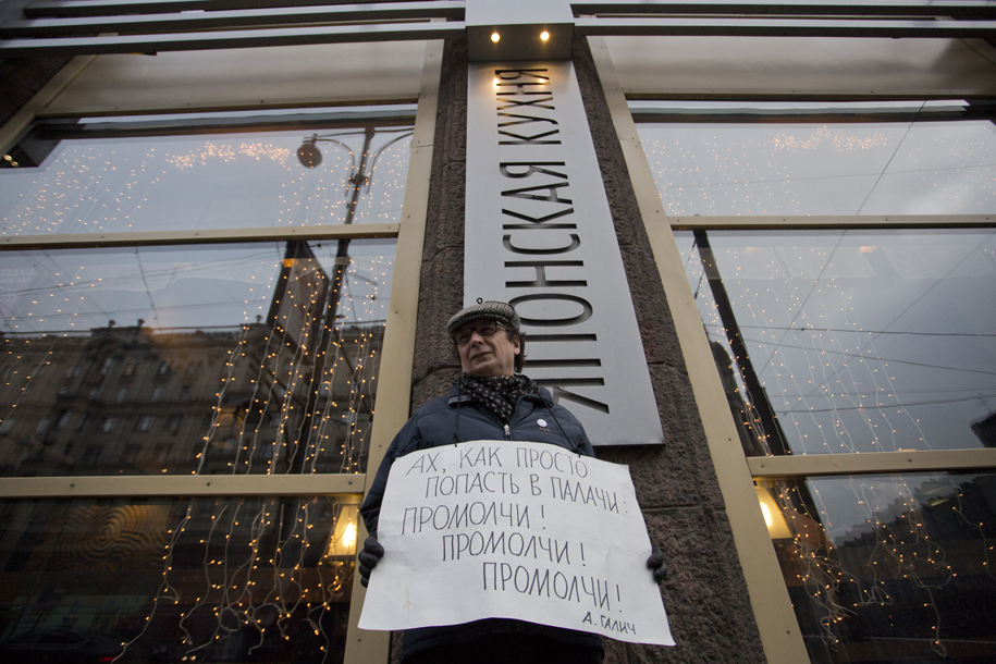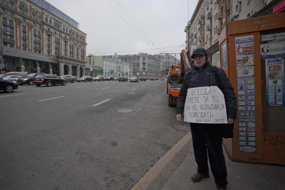 Сегодня утром на Тверской улицы гражданские активисты вторую субботу подряд выстроились цепью одиночных пикетов с плакатами в поддержку политзаключенных. Некоторые из них держали цитаты из Галича и Сартра - о том, как равнодушный становится соучастником.