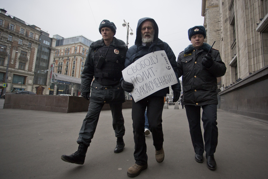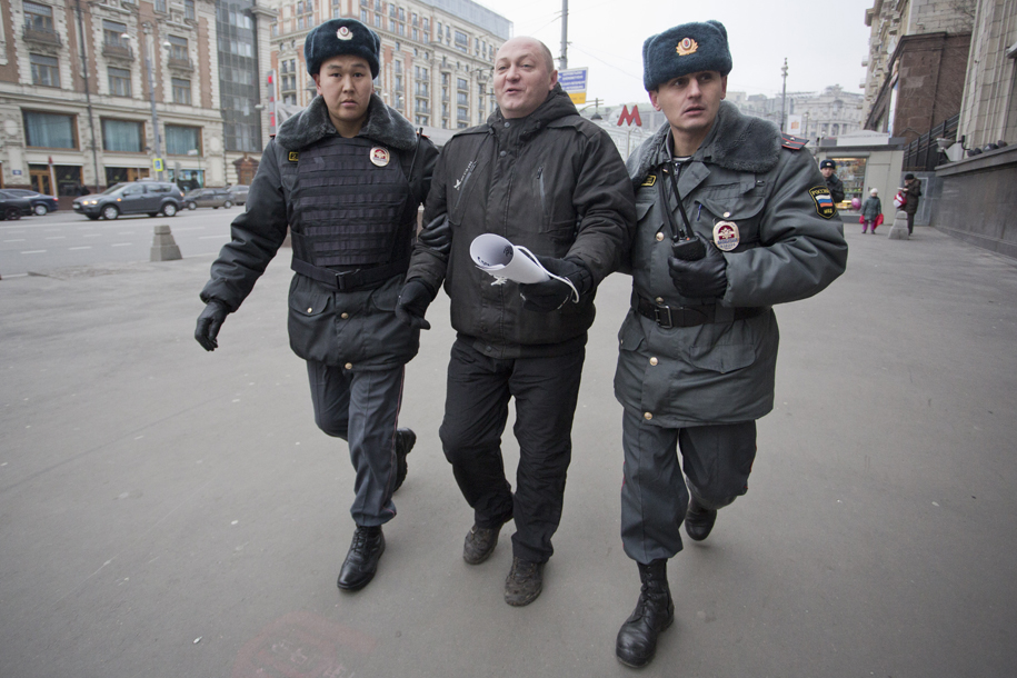 Задержания произошли на углу у здания Думы. Команду отдавал полковник: по его мнению, пикет перестал быть одиночным, когда стоящими рядом на несколько минут оказались да активиста - один с развернутым плакатом, а второй со сложенным. Всего в акции приняло участие около десяти человек.