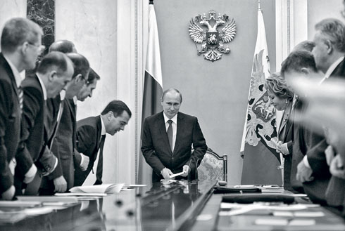 Президент России Владимир Путин (в центре) на фоне членов Совета безопасности. Москва, 21 ноября