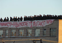 В субботу началась акция протеста заключенных колонии. Они захватили вышку в промзоне, на которой вывесили плакат "Люди, помогите". Кроме того, с крыш зданий колонии вывесили баннеры с сообщениями об акции протеста с участием 1500 человек против пыток и вымогательств. По словам очевидцев, один человек упал с вышки.