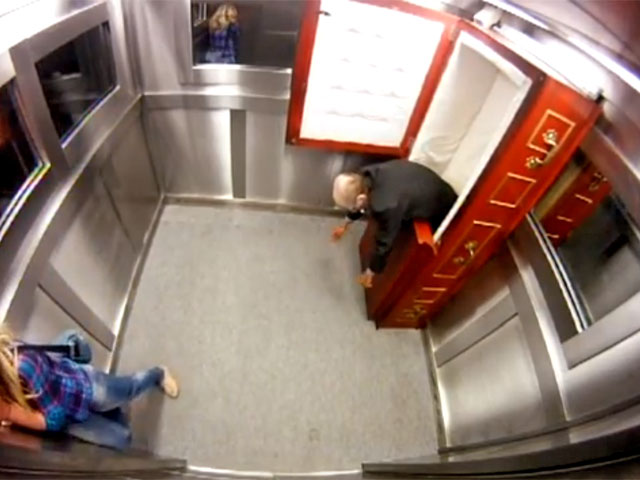 Но на этот раз несчастных посетителей офисного здания решили напугать мертвецом. По сценарию, жертва шутки заходит в лифт и откликается на просьбу придержать двери - трое мужчин в черных костюмах и с гробом влезают следом. Затем они просят подождать их и выходят, якобы чтобы забрать венок.
