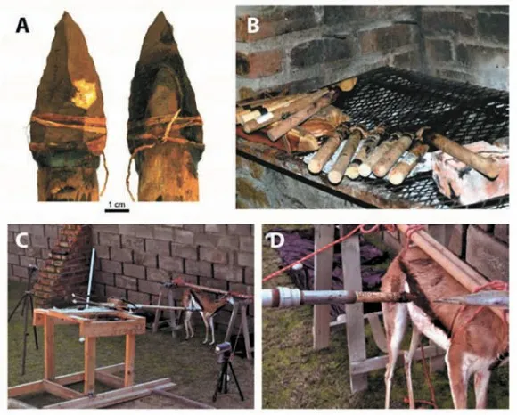 (A) копии наконечников KP1, прикрепленные к древку с помощью смолы акации и коровьих сухожилий;