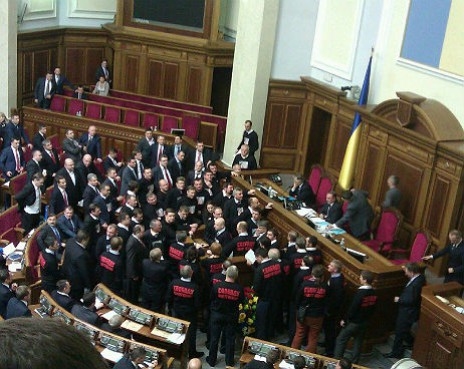 Несогласие возникло вот по какому поводу: депутаты должны были сегодня выбрать спикера, однако во время голосования оппозиционеры из «Свободы» и «Батькiвщины» уличили коллег из враждебной Партии регионов в том, что те голосуют за отсутствующих кандидатов. Когда они потребовали повторного личного голосования, то председательствующий член «ПР» предоставил все-таки слово кандидату на должность спикера от его партии Владимиру Рыбаку.