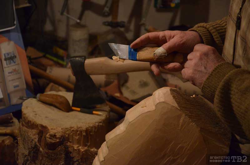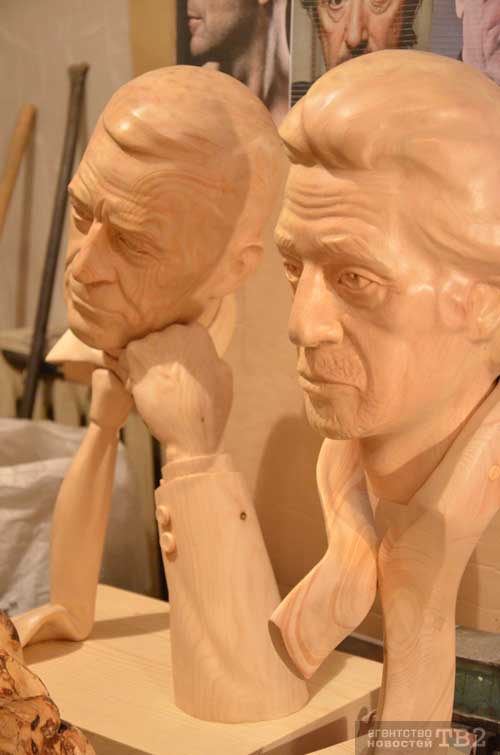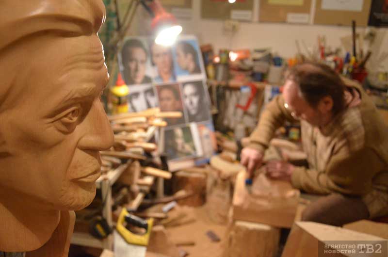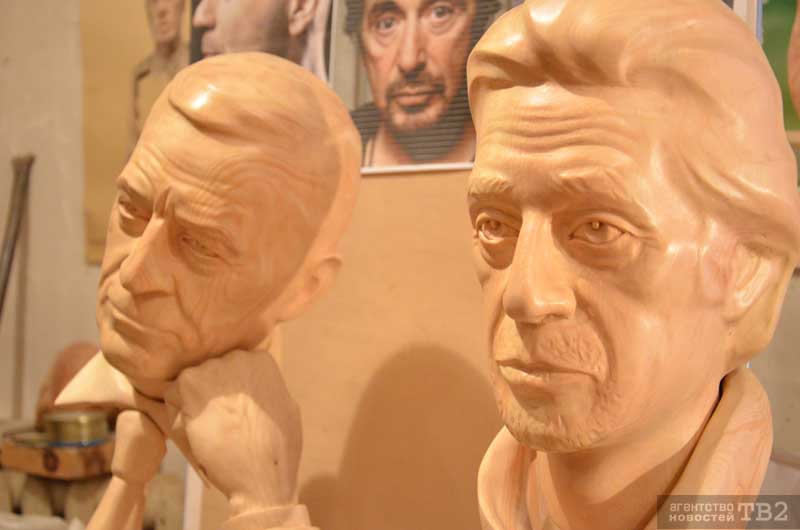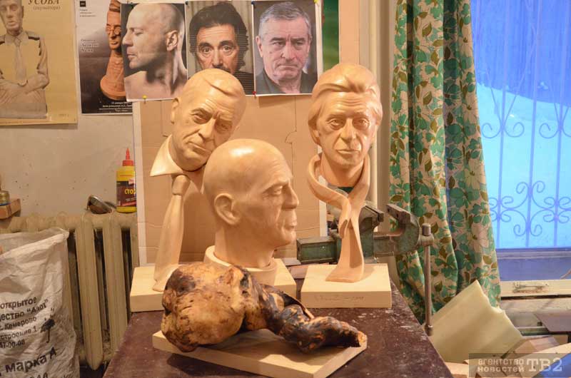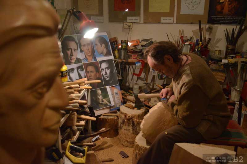 «В мастерской работа идет полным ходом. Уже готовы три деревянные головы. Сейчас Леонтий Усов работает над изображением Николаса Кейджа. Всего голов будет 10 - все эти работы отправятся на выставку в далекий Голливуд», - пишет Александра Компанец.