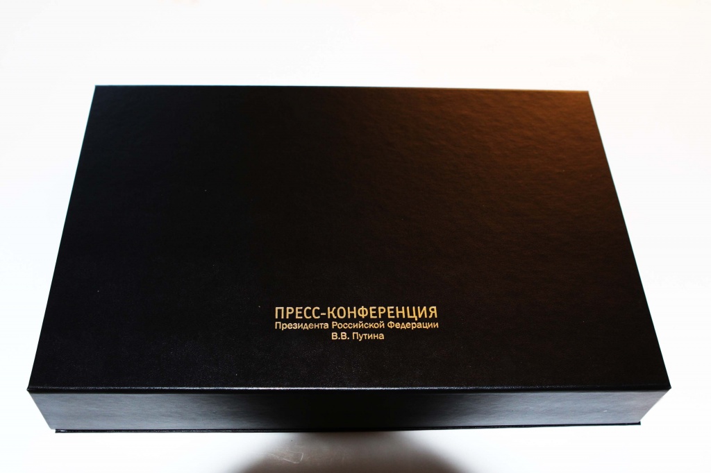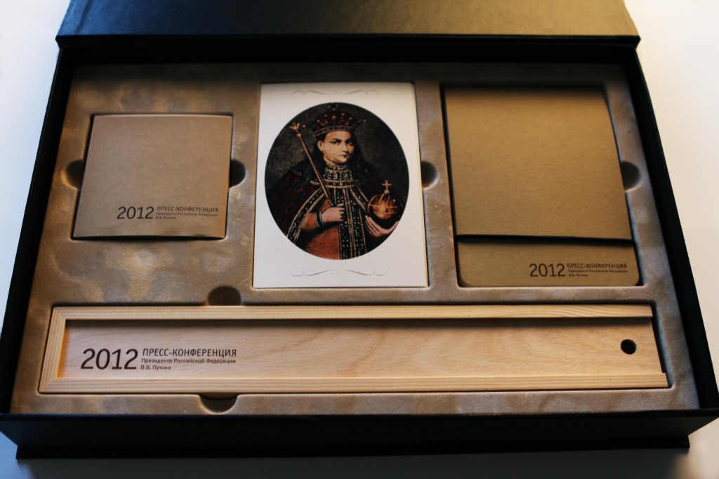 Корреспондент The New Times получил вместе с аккредитационным бейджем подарок от администрации президента — внушительного размера стильную черную коробку с золотым тиснением. Внутри оказался набор «юного журналиста» — бумажный блок для записей, блокнот, клипборд с наклейкой «Сделано в Польше, срок годности не ограничен», деревянный пенал(внутри — точилка, линейка, стерка и карандаши) и…набор открыток с портретами царей и императоров династии Романовых.