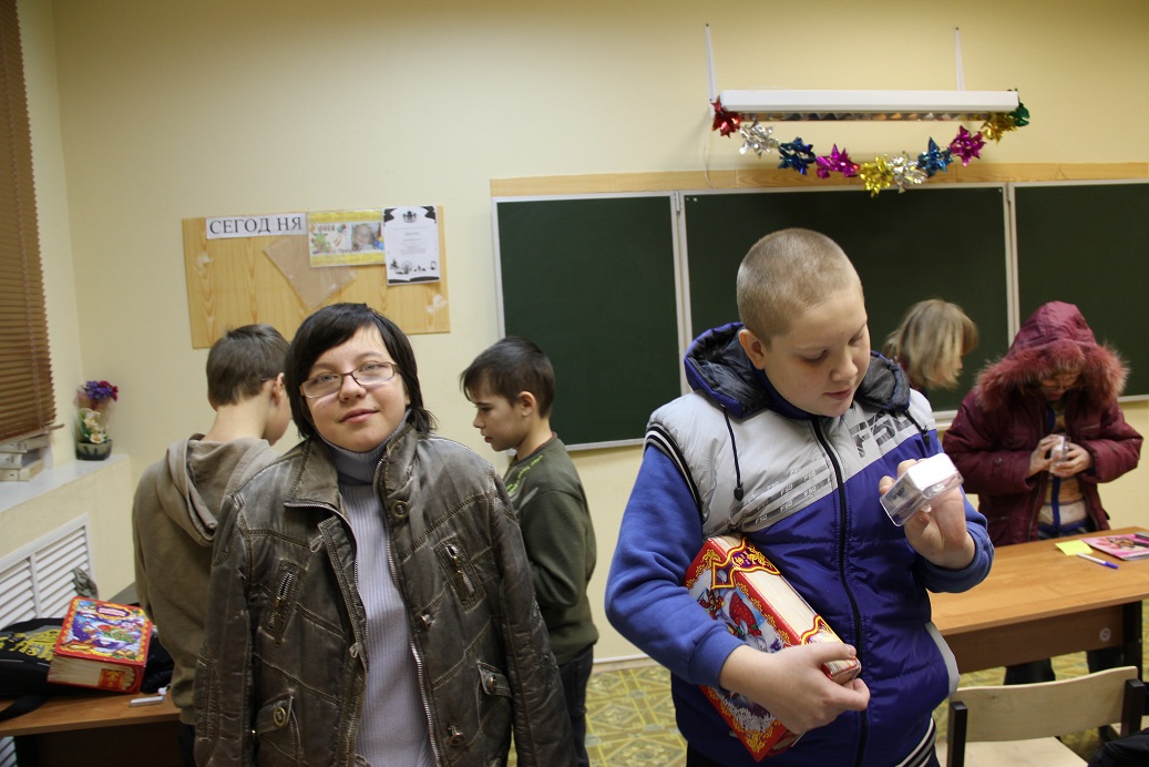 Когда волшебник зашел в класс и начал раздавать подарки, ребята пришли в полный восторг! Они явно не ожидали, что кроме сладких подарков получат еще и mp3-плееры! Шестиклашки обнимали Деда. благодарили и просили с ним сфотографироваться.