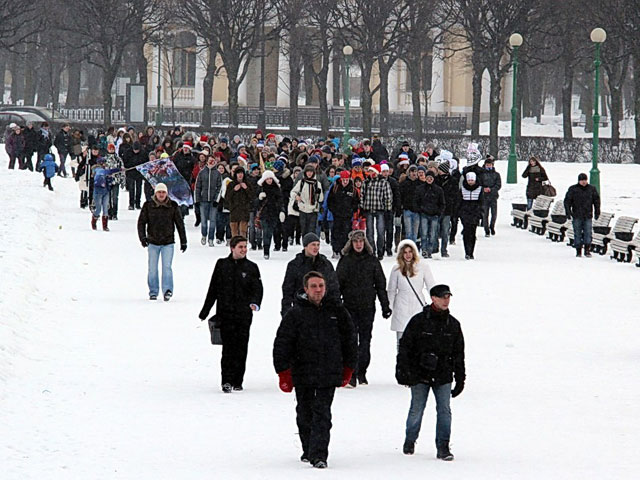 Несколько сотен человек в соцсети договорились устроить снежное побоище. Однако уже через пять минут после начала акции на место прибыли наряды полиции. Через мегафон стражи порядка строго заявили собравшимся, что мероприятие не согласовано, и призвали их разойтись.