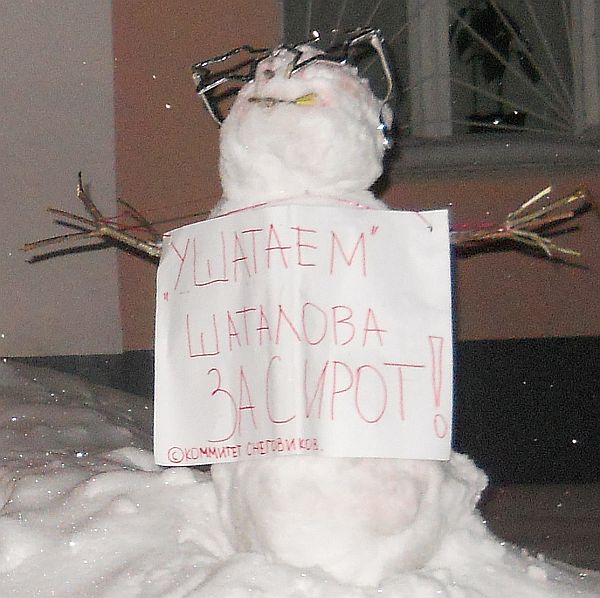 На днях у здания администрации Омутнинского городского поселения Кировской области очевидцы обнаружили вот такого «пикетирующего» снеговика с плакатом: “Ушатаем” Шаталова за сирот!», сообщают «Омутнинские Вести+». Пылкий гнев холодного «активиста комитета снеговиков» был направлен на заместителя главы администрации по социальным вопросам Игоря Шаталова. Судя по отзывам омутнинцев, с мнением пикетчика местные жители согласны: «Сколько бал будут править проходимцы и случайные люди-пустышки типа Шаталовых! Всё образование и здравоохранение развалено. Уже и в детсад при них по блату! К ответу проходимцев и гнать из власти!». Жаль только, что снеговик не долго пикетровал – убрали активиста на следующий же день, как утверждают очевидцы.