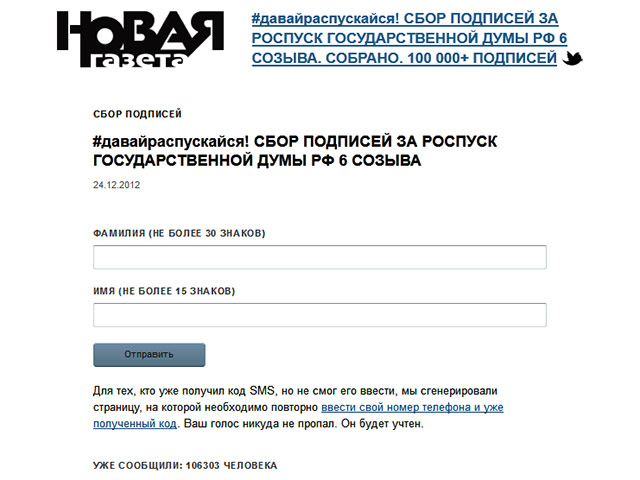 "Новая газета" собрала уже более 100 тысяч подписей за досрочный роспуск Государственной думы в связи с принятием ею так называемого "антимагнитского закона" о запрете усыновления иностранцами российских сирот. Под предложением распустить нижнюю палату парламента, озаглавленным хэштегом "#давайраспускайся", к полудню четверга подписались более 105 тысяч человек. Онлайн-голосование продолжается.