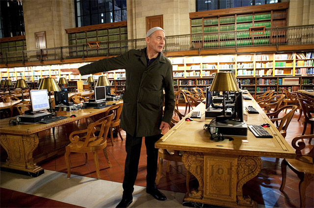 Рэм Колхас показывает на место в Rose Main Reading Room Нью-Йоркской публичной библиотеке, на котором он постоянно сидел, пока писал книгу. Фото Jori Klein из блога A Daily Dose of Architecture «Мне нужен мир иной, огромный как нелепость…