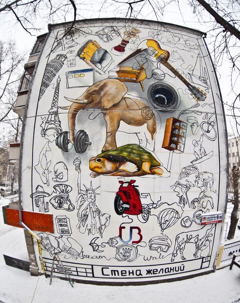 В канун Нового Года команда SreetArt и УБРиР завершили онлайн-граффити проект "Стена желаний". На специально созданном сайте www.dream-wall.ru каждый человек мог оставить свою самую заветную мечту, комментарий и фотографии к ней. Сотни людей доверили нам свои желания и мечты, которые профессиональные художники изобразили в масштабном граффити на стене одного из домов в центре Екатеринбурга. Стена стала местом объединения желаний путешествовать, плавать с дельфинами, кататься на галапагосской черепахе, стать владельцем автомобилей и мотоциклов всех марок и видов, быть известным актером, музыкантом, фотографом, режиссером, женой, мужем, папой и мамой. Искренние желания людей сделали эту стену особенной и наделили ее волшебной силой, способной творить чудеса. Часть общей композиции, выполненной в технике монолинии и фотореализма, представляет собой место, куда можно приложить руку и загадать свое собственное желание. Мы уверенны, что та энергия и искренность, с которой люди участвовали в проекте и создавали рисунок, станет силой, способной исполнить желание каждого, кто прикоснется к нему.