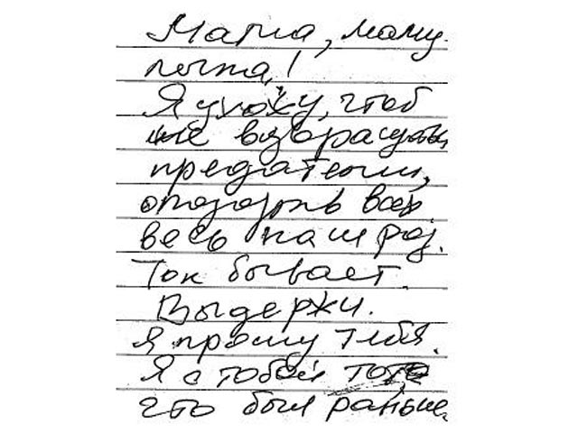 "Мама, мамулечка! Я ухожу, чтобы не возвращаться предателем, опозорить всех, весь наш род. Так бывает, выдержи. Я прошу тебя, я с тобой. Ничего, вы выдержите. Это лучший вариант. В России скажите, что это просто несчастный случай. Что довело меня до бегства из России. Лень и разгильдяйство не дали изучить новые законы. Я предал честного человека, предал безопасность Родины. Если это возможно, отправьте мое тело в Россию. Россия сильна, как ни одна другая страна. И будет только сильней. Жить в России <неразборчиво> лучше, чем где бы то ни было".