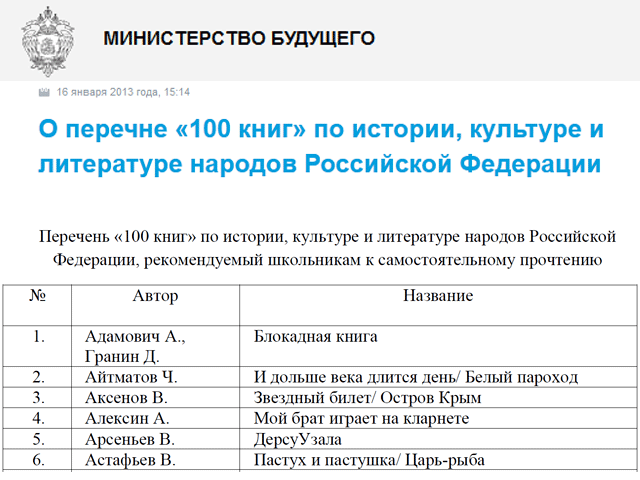 Напомним, год назад такой список предложил составить в одной из своих предвыборных статей тогда еще премьер Владимир Путин. "В некоторых ведущих американских университетах в 20-е годы прошлого века сложилось движение за изучение западного культурного канона. Каждый уважающий себя студент должен был прочитать 100 книг по специально сформированному списку. Давайте проведем опрос наших культурных авторитетов и сформируем список 100 книг, которые должен будет прочитать каждый выпускник российской школы", - призвал Путин.