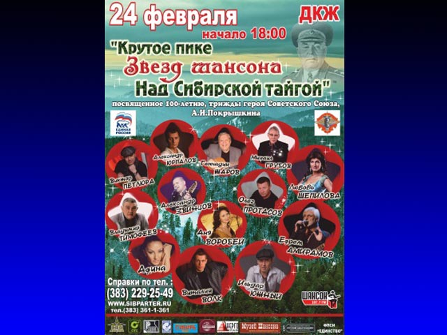 В честь героя войны решено устроить четырехчасовой фестиваль шансона под названием "Крутое пике звезд шансона над Сибирской тайгой", сообщил во вторник сайт регионального отделения единороссов.