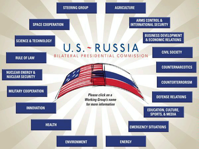 Двусторонняя российско-американская президентская комиссия была создана 6 июля 2009 года во время визита президента США Барака Обамы в Россию. В духе объявленной "перезагрузки" отношений между двумя странами основными задачами этого органа были заявлены "преодоление менталитета холодной войны и начало нового этапа сотрудничества ради "обеспечения на будущее совместного прогресса и процветания". Тогда в качестве ее сопредседателей были назначены вице-премьер правительства РФ Владимир Сурков и посол США в РФ Майкл Макфол. Впоследствии их должности заняли Долгов и Мелия.
