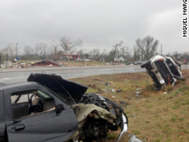 В общей сложности торнадо разрушили десятки домов, на дорогах лежат поваленные деревья и перевернутые автомобили.