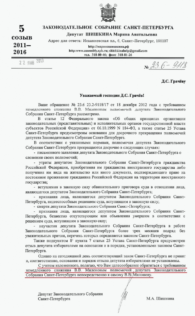 В декабре 2012 года каждый из 50 депутатов Законодательного собрания Санкт-Петербурга получил обращение от инициативной группы жителей города с просьбой отправить в отставку депутата Виталия Милонова за то, что благодаря его законодательным инициативам «за Петербургом стал закрепляться имидж столицы гомофобии и мракобесия, который наносит очевидный вред репутации города и унижает чувство собственного достоинства петербуржцев». Это обращение было передано вместе с письмом, подписанным известными петербуржцами — бардом Александром Городницким, ныне покойным адвокатом и правозащитником Юрием Шмидтом, заслуженным артистом России Алексеем Девотченко, историком и публицистом Даниилом Коцюбинским и другими.