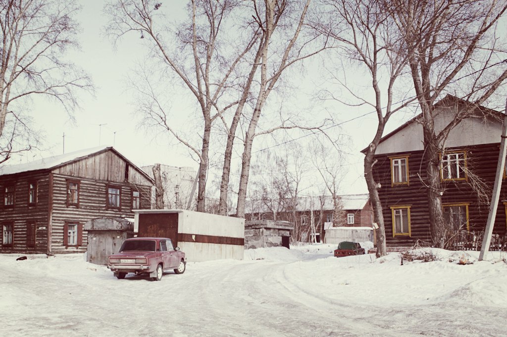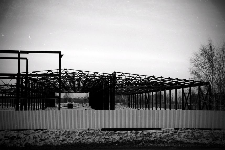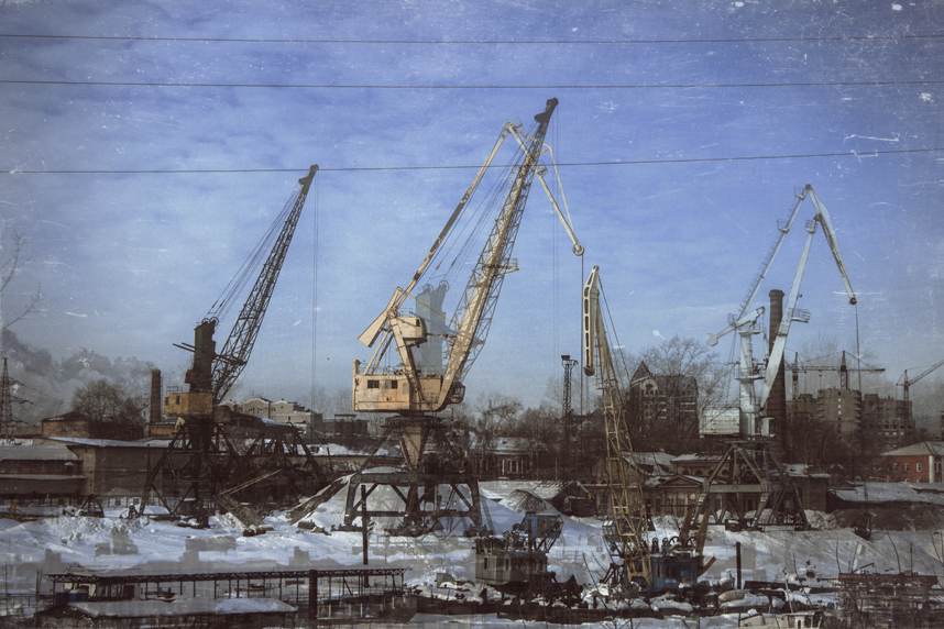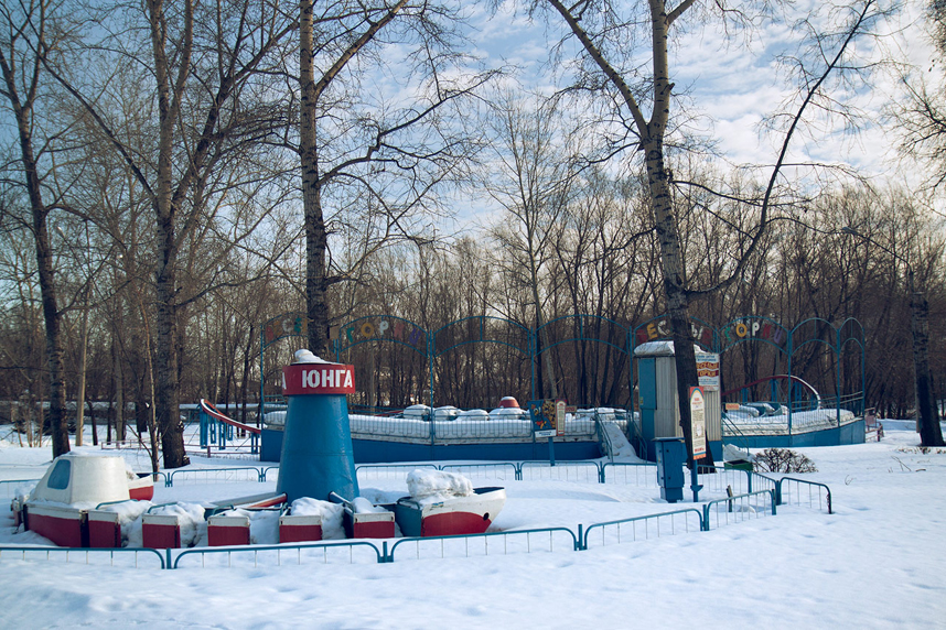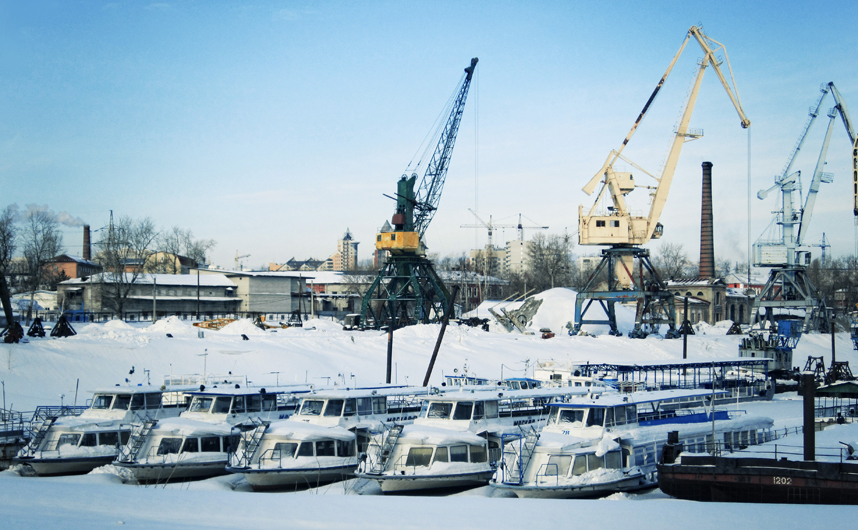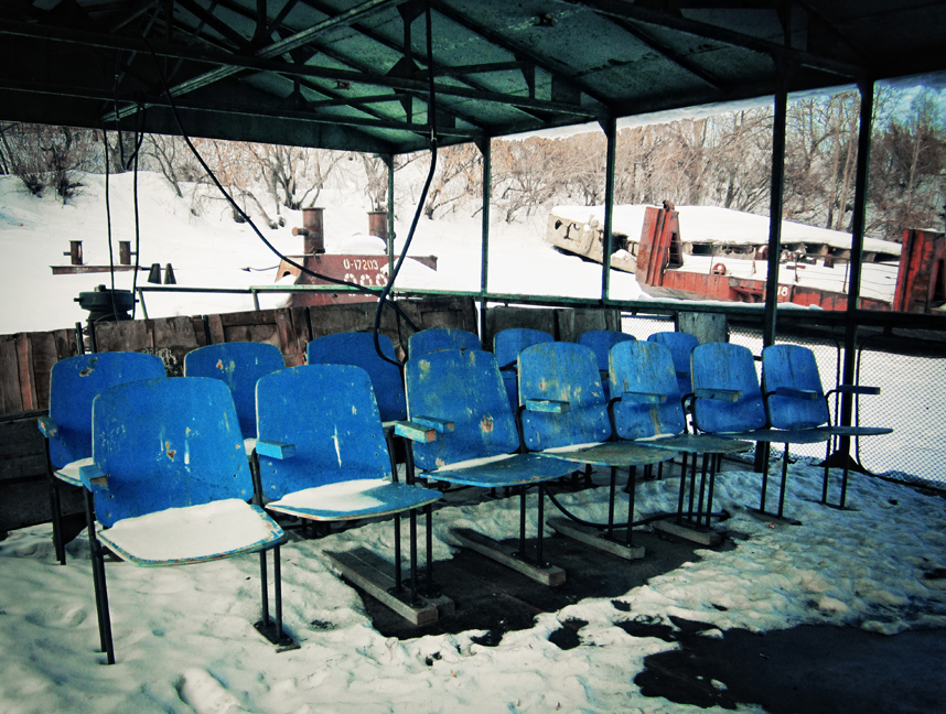 Денис Кочетков. Речпорт в Ковше и Заковшовье. Спят пароходы в ожидании весны. Обшарпанные сиденья речной веранды ждут пассажиров. На другой стороне Ковша бесконечной вереницей грузовики везут песок на улицы и стройки города. В самом устье Барнаулки высится печальной черной башней на фоне синего неба вечный недострой-многоэтажка.