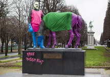 Накануне неизвестные оформили памятник солдатам и офицерам Русского экспедиционного корпуса, воевавшим во Франции в Первую мировую войну, в стиле Pussy Riot. На голову офицера надели желтую балаклаву, на туловище - розовое платье, а ноги раскрасили ярко-голубым. Скульптуру коня выкрасили в фиолетовый цвет, обернув морду голубой тканью и надев на спину зеленую накидку. На пьедестале неизвестные оставили надпись розовой краской "Free Pussy Riot".