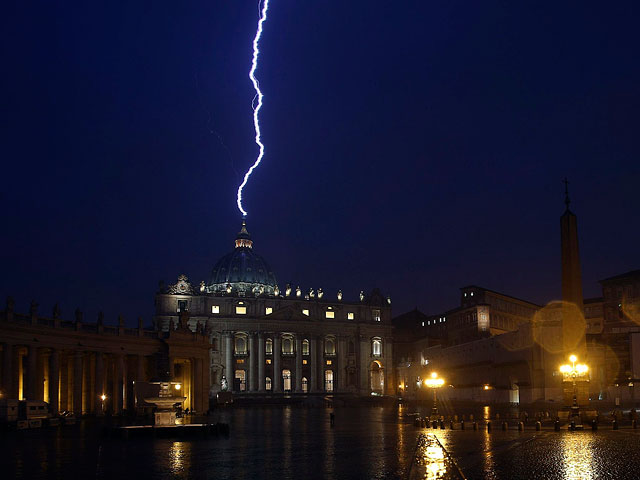 Вечером 11 февраля, после объявления Папы Римского Бенедикта XVI об отставке, над итальянской столицей разразилась гроза. При этом сверкнувшая над Ватиканом молния ударила в самый купол собора Святого Петра, сообщает портал "Православие.by" со ссылкой на информацию британской газеты The Daily Mirror.