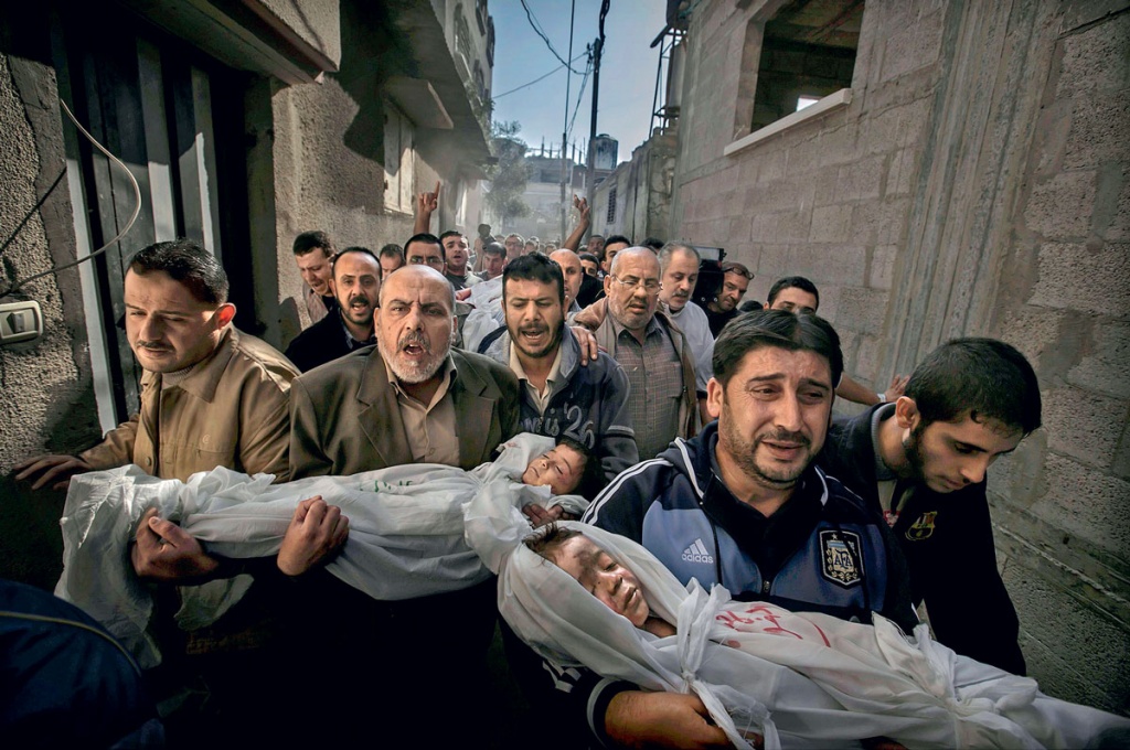 14 ноября 2012 года на Ближнем Востоке опять началась война, спустя шесть дней в Газе похоронили двухлетнюю Сухаиб Хиджази, ее трехлетнего брата Мухаммада и их отца Фуада, которые погибли во время израильского артобстрела. На фотографии — братья Фуада несут детей для погребальной церемонии в мечеть.