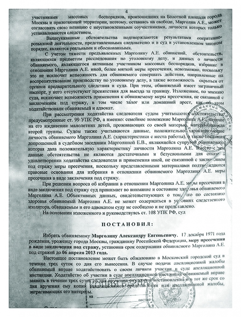 Александр Марголин стал 15-м арестантом и 21-м фигурантом так называемого «Болотного дела» (см. стр. 13). В распоряжение The New Times попало типичное постановление Басманного суда о взятии обвиняемого под стражу, решившее судьбу 41-летнего москвича, отца двоих детей Александра Марголина. По мнению суда, он является «активным участником массовых беспорядков, имеет заграничный паспорт, у него отсутствуют препятствия для выезда за границу». Это, рассудил суд, «исключает возможность применения к обвиняемому меры пресечения, не связанной с заключением под стражу» — то есть залога или домашнего ареста, о которых просили обвиняемый и его адвокат. Только тюрьма.