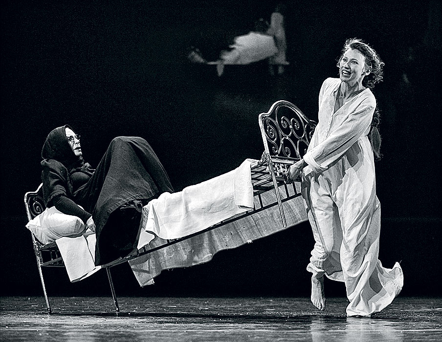 Адомас Яцовскис свой спектакль начинает еще до появления героев. Это тот случай, когда зал аплодирует художнику. Огромное мутное, затягивающее своими искривленными отражениями зеркало на весь задник, в котором движутся причудливые фигуры, плывет огонек крещенской свечи… Балетный станок, вдоль которого вышагивает француженка с хлыстом и покрикивает на сбившихся в стайку девушек-учениц. Старое пианино. Старый буфет. Кровать — обиталище девичьих страданий и слез, на которой то мечется в любовном бреду Татьяна, то затихает на коленях Няни, то вскакивает, сраженная ночным кошмаром. Садовая лавка, где Онегин отверг Татьянину любовь, превращается в крест, в проклятие и не отпускает Татьяну от себя. Так с этой лавкой она и громыхает по всей сцене, униженная, разбитая унижением.