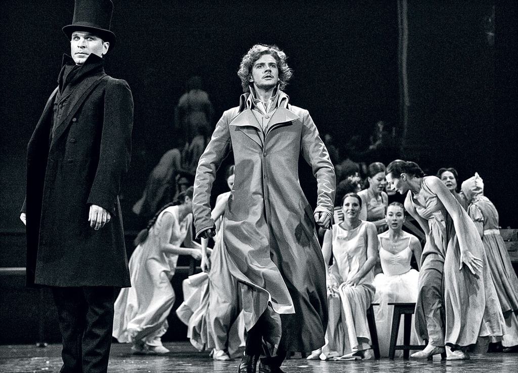 Мелодия «Старинной французской песенки», известная каждому, кто в детстве учился играть на пианино, превращается то в колыбельную, то в колокольный звон, то в подпрыгивающую мазурку, то в безумный трагический вальс. Под эту музыку будет кружить метель, и карета с фонарями увязнет в снегу, и будет бал, и именины, и шампанское, и надменный молодой человек в высоком цилиндре и черном сюртуке величественно пройдет вдоль балетного станка, перешагивая через падающих к его ногам девушек.