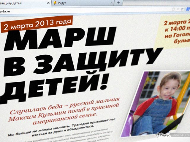Помимо этого, участники будущей акции собираются потребовать возвращения на Родину Кирилла Кузьмина, чей брат Максим погиб в приемной семье в США и чья родная мать никак не может завязать с пьянством. "Помоги нам собрать подписи Президенту России и вернуть Кирилла на Родину!" - призывают активисты на сайте, специально созданном по случаю планируемого шествия.